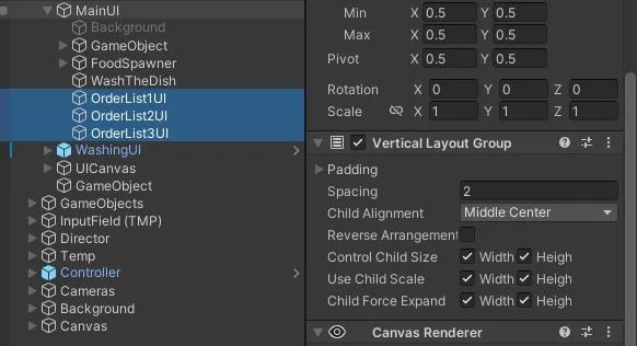 - Vertical Layout Group을 포함하고 있는 Canvas 내의 객체(OrderList1UI… 등)의 자식으로 프리팹을 생성하여 UI 상으로 정렬이 되는 방법 공유.