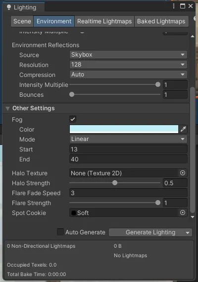 - Windows → Rendering → Lighting 탭에서 Fog 관련 설정을 변경함.